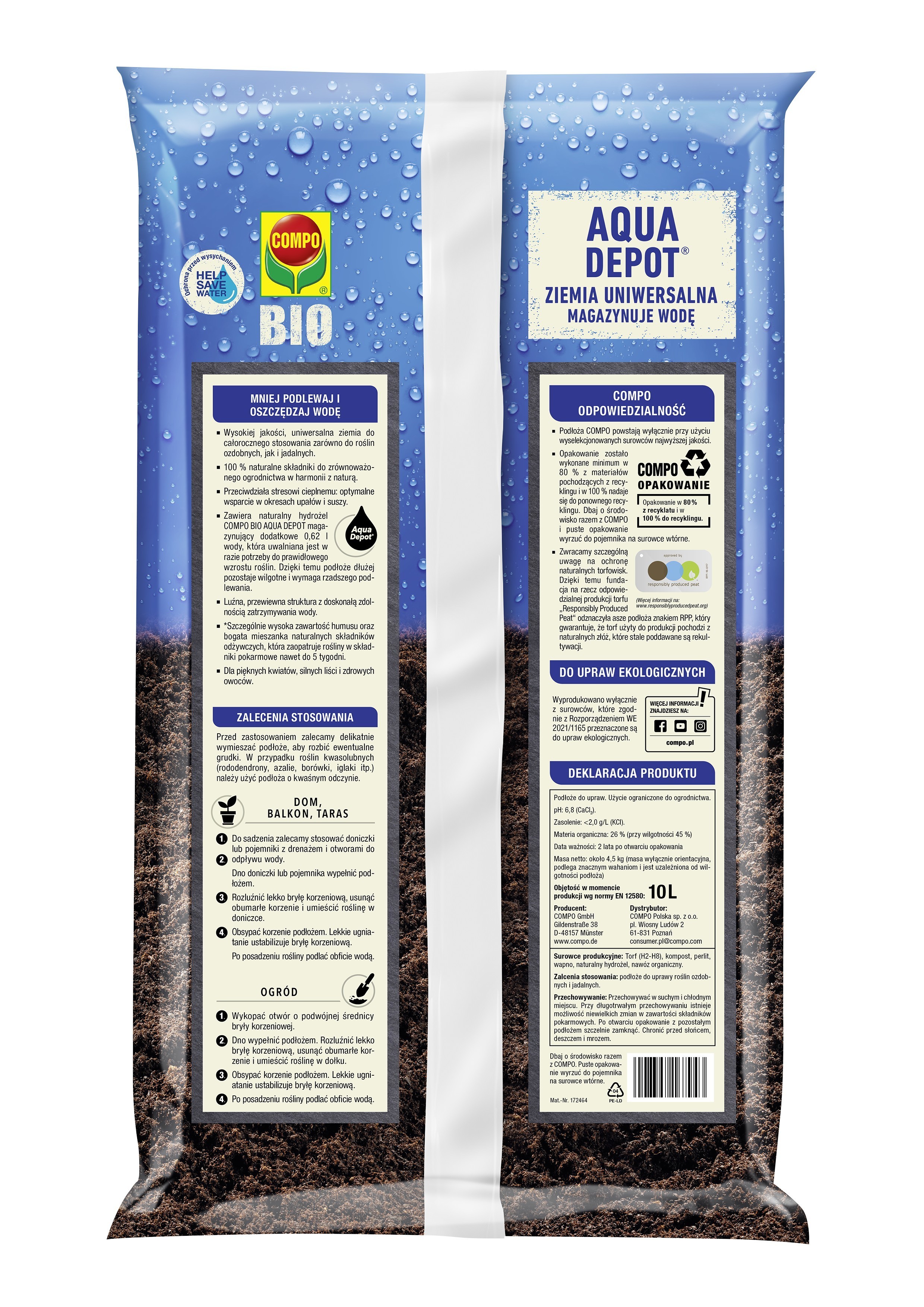 Bio Aqua Depot Ziemia uniwersalna marki Compo to ekologiczna, gotowa do użycia mieszanka do uprawy roślin w domu, ogrodzie i na balkonie. Dzięki zawartości hydrożelu Aqua Depot skutecznie magazynuje wodę i stopniowo ją uwalnia, co pomaga utrzymać optymalną wilgoć i ogranicza częstotliwość podlewania.