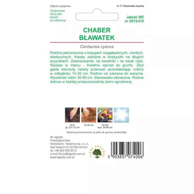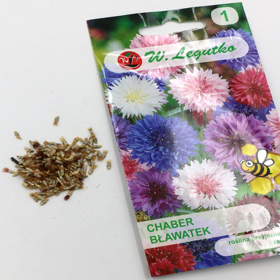 Chaber bławatek (Centaurea cyanus) to jednoroczna roślina miododajna, cechująca się delikatnymi, rozgałęzionymi łodygami, których elastyczność nadaje jej lekki, zwiewny charakter. Kwiaty układają się w koszyczki, uniesione na długich szypułkach, tworząc niepowtarzalną kompozycję w ogrodzie. W tej mieszance można odnaleźć chabry m.in. w takich kolorach jak: biały, różowy, fioletowy czy niebieski.