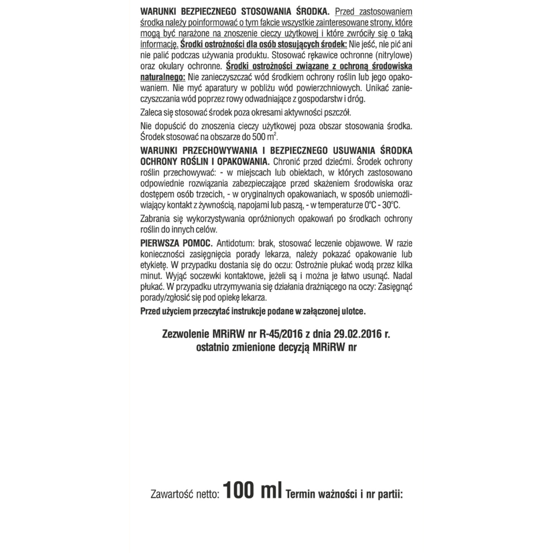 Opakowanie 100 ml rozrobić z 25 l wody co pozwala na oprysk 500 m² powierzchni.