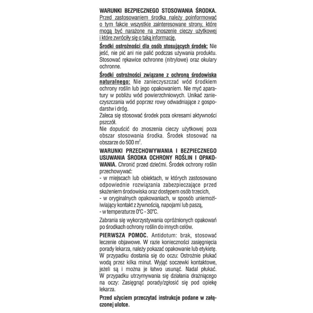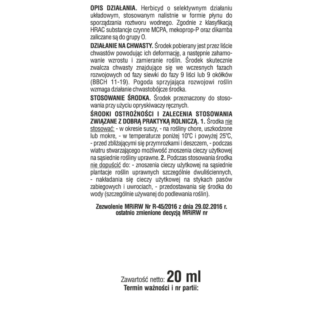 Opakowanie 20 ml rozrobić z 5 l wody co pozwala na oprysk 100 m² powierzchni.