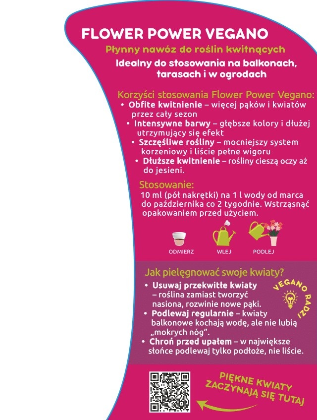 Flower Power Vegano - to wysokiej jakości płynny nawóz z 9 % zawartością potasu opracowany specjalnie do roślin kwitnących, które wymagają dodatkowego wsparcia w okresie wzrostu i tworzenia pąków. Jego formuła została przygotowana tak, aby ułatwić roślinie utrzymanie intensywnych barw, dobrej kondycji oraz zdrowszego tempa rozwoju.