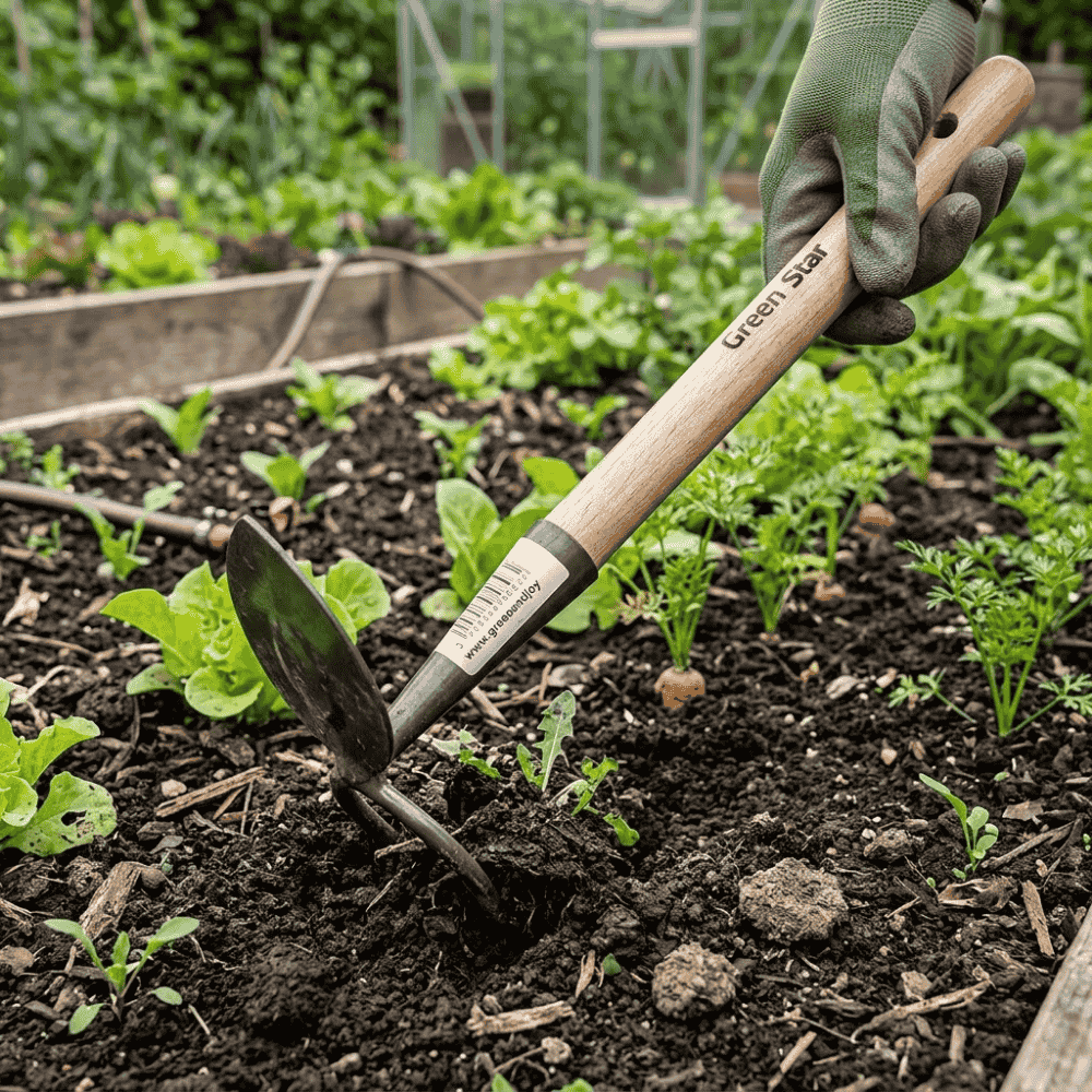 Haczkopazurki ręczne Pro Natura – Green Star to praktyczne połączenie dwóch narzędzi w jedno, dzięki czemu oszczędzasz miejsce na ich przechowywanie. Strona z haczką o delikatnie zaokrąglonej końcówce ułatwia spulchnianie gleby w trudnodostępnych miejscach. Pazurki z dwoma ząbkami to precyzyjne narzędzie do plewienia między grządkami warzyw, bez obaw o uszkodzenie ich korzeni czy części nadziemnych roślin.