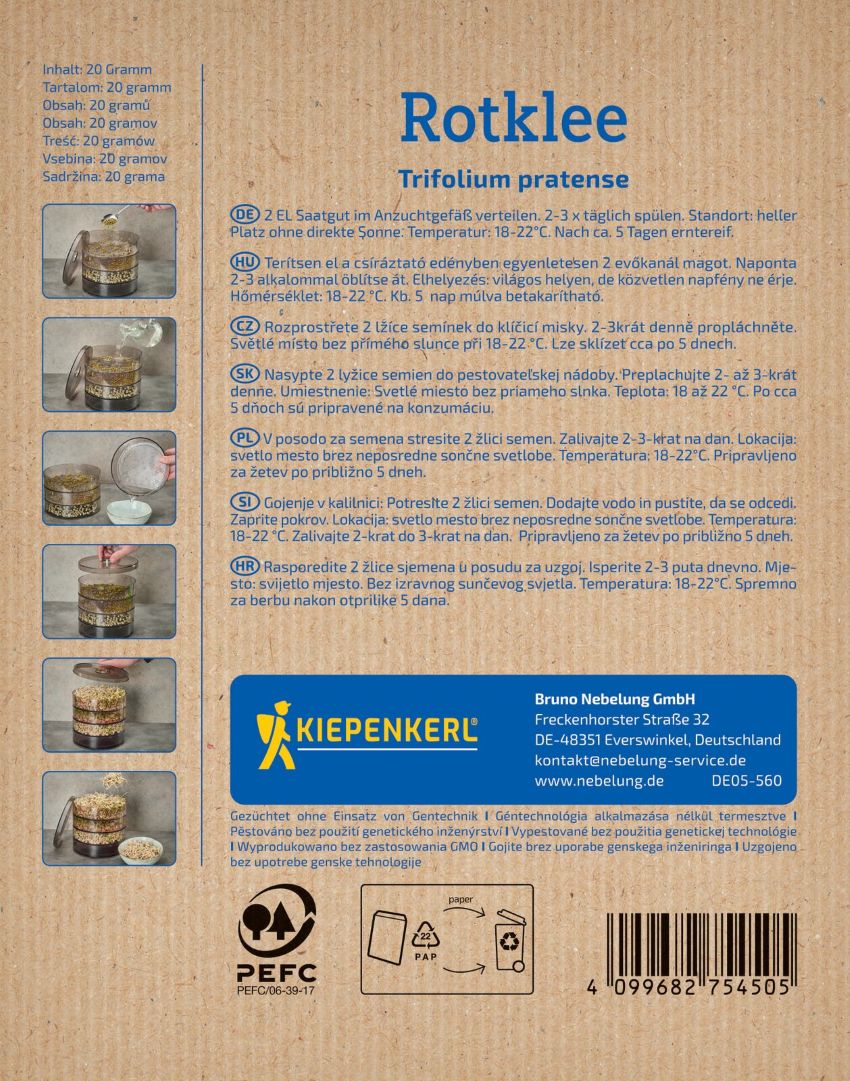 Nasiona koniczyny łąkowej Rotklee z przeznaczeniem od wysiania na kiełki. Opakowanie zawiera 20 g nasion, co odpowiada ok. dwóm łyżkom stołowym.