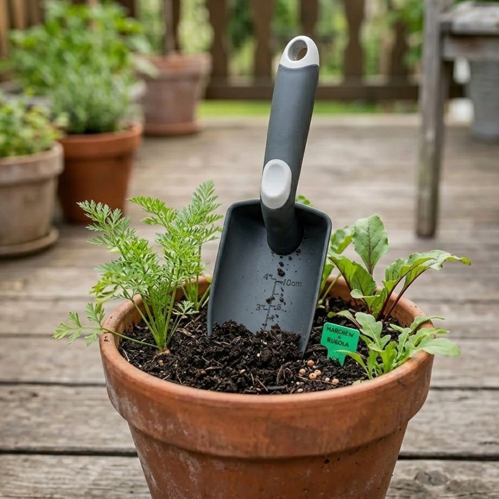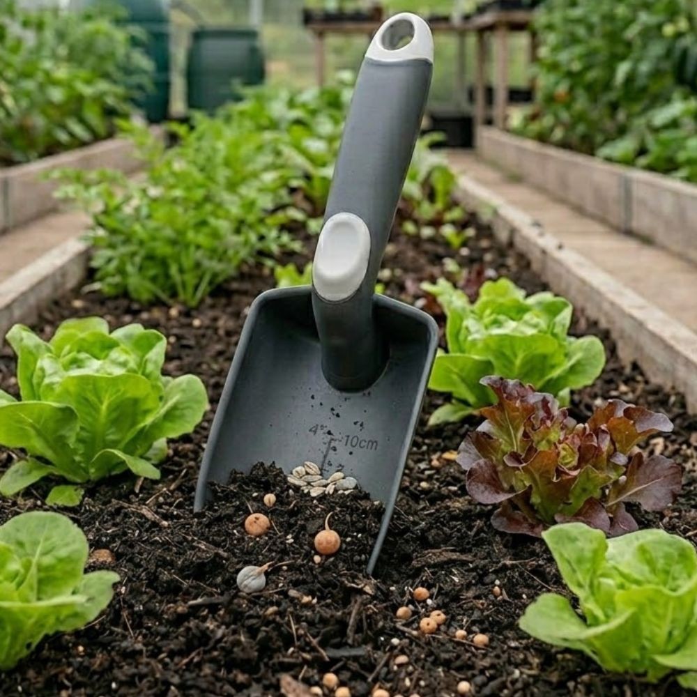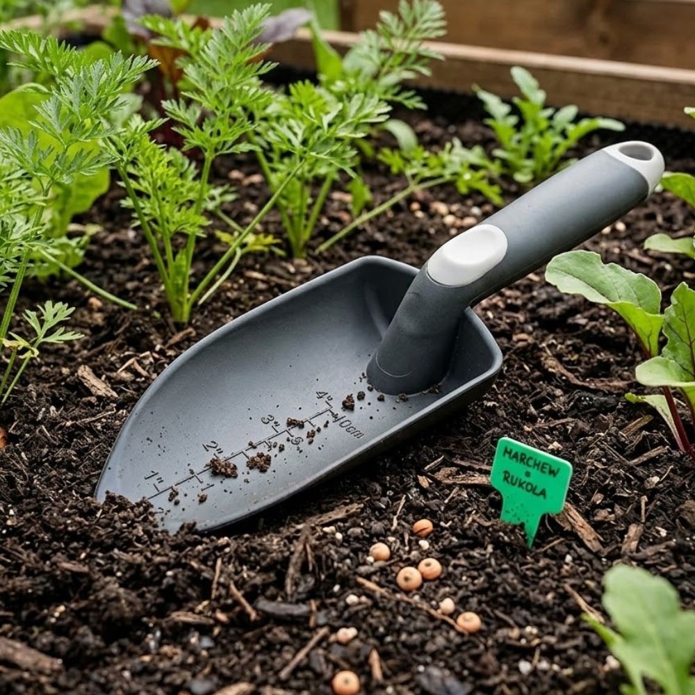 - wbudowana podziałka: miarka w centymetrach i calach pozwala kontrolować głębokość dołków podczas sadzenia,