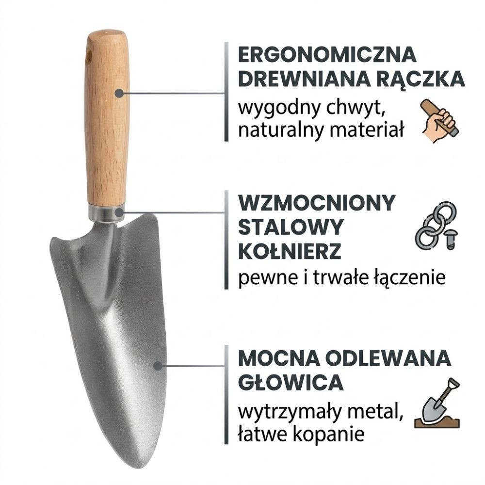 - uniwersalny rozmiar: długość 27 cm pozwala na wygodną pracę zarówno w ogrodzie, jak i w mniejszych donicach,