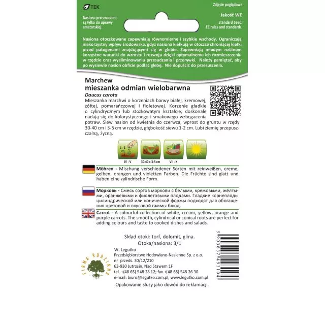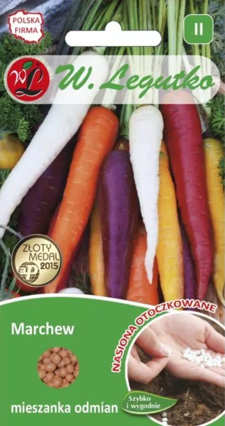 Mieszanka wyjątkowych nasion marchwi, składająca się z różnych odmian o korzeniach w kolorze białym, kremowym, żółtym, pomarańczowym i fioletowym. Korzenie charakteryzują się gładką powierzchnią i przyjmują cylindryczny lub stożkowaty kształt. Są one nie tylko atrakcyjne wizualnie, ale również doskonale nadają się do różnorodnych kulinarnych kreacji, wzbogacając potrawy zarówno pod względem kolorystyki, jak i smaku.