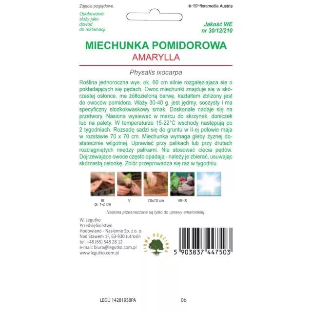 Miechunka pomidorowa Amarylla (Physalis ixocarpa) to pierwsza polska odmiana tej ciekawej rośliny o niezwykle zdrowych owocach. Miechunka uprawiana jest jako roślina jednoroczna w polskim klimacie. Osiąga ok. 60 cm wysokości i wykształca silnie rozgałęziające się, pokładające pędy. Tworzy żółtozielone owoce, umieszczone w skórzastej osłonce, które kształtem przypominają pomidorki koktajlowe. Są jędrne, soczyste i wyróżniają się specyficznym słodkokwaskowym smakiem. Pojedynczy owoc waży zazwyczaj ok 30-40 g. Miechunka to doskonały wybór do przetworów.