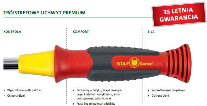 Miotłograbie wachlarzowe ze zintegrowanym trójstrefowym trzonkiem to zupełnie nowy komfort pracy w ogrodzie. Pierwsza strefa uchwytu odpowiada za kontrolę – została specjalnie wyprofilowana pod palce i dla ochrony dłoni, środkowa za komfort – zapewnia pracę bez zmęczenia i odcisków dzięki zaokrąglonym kształtom i miękkiemu, przyjemnemu w dotyku, antypoślizgowemu wykończeniu. Specjalnie wyprofilowana końcówka trzonka odpowiada za siłę.