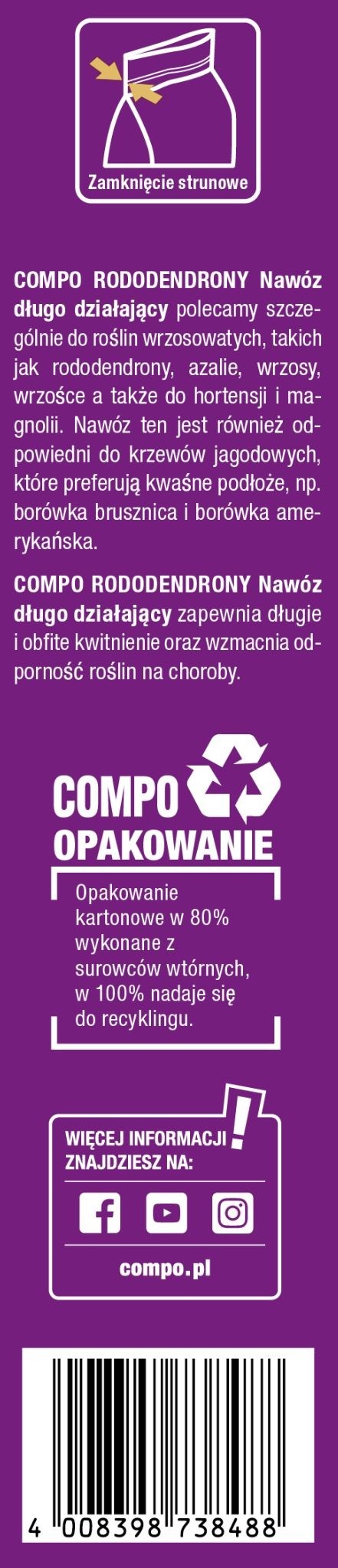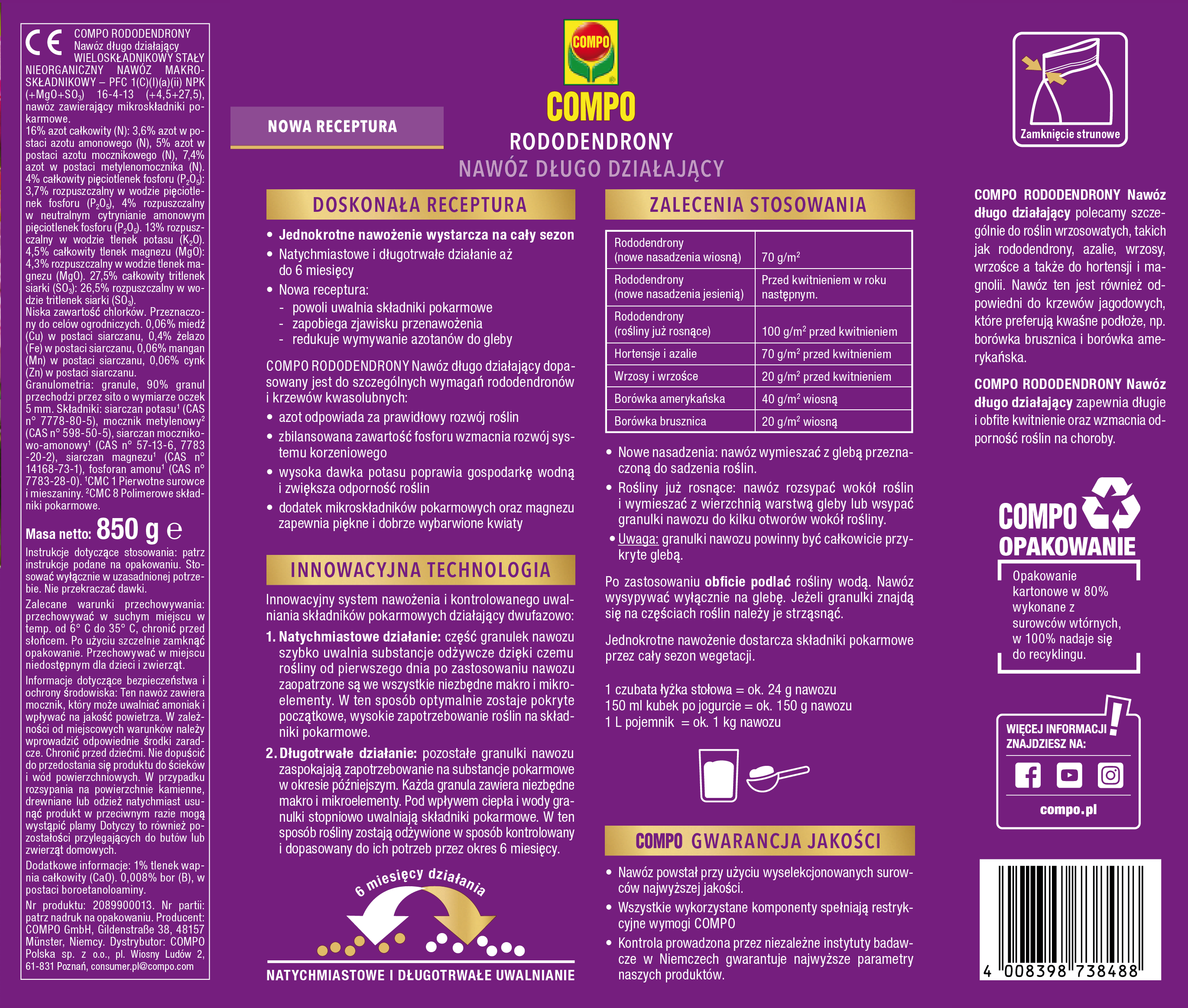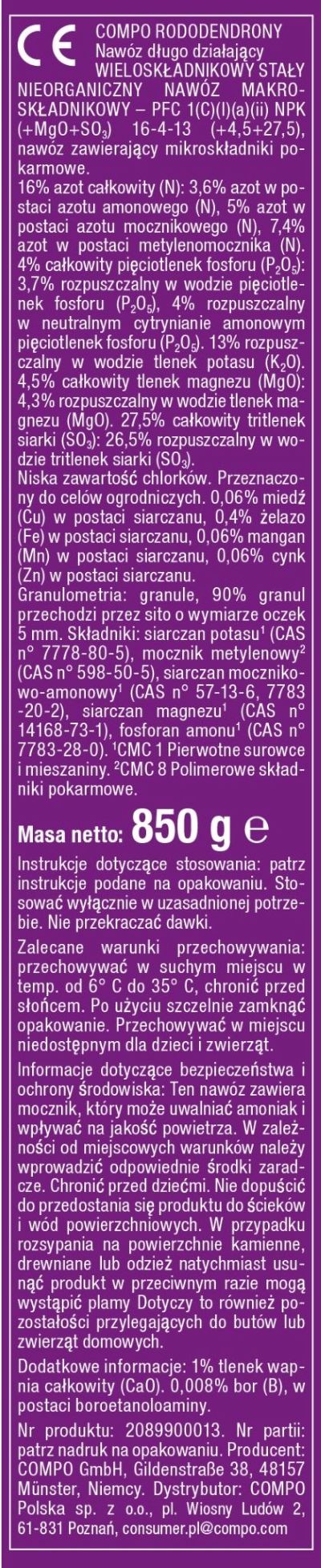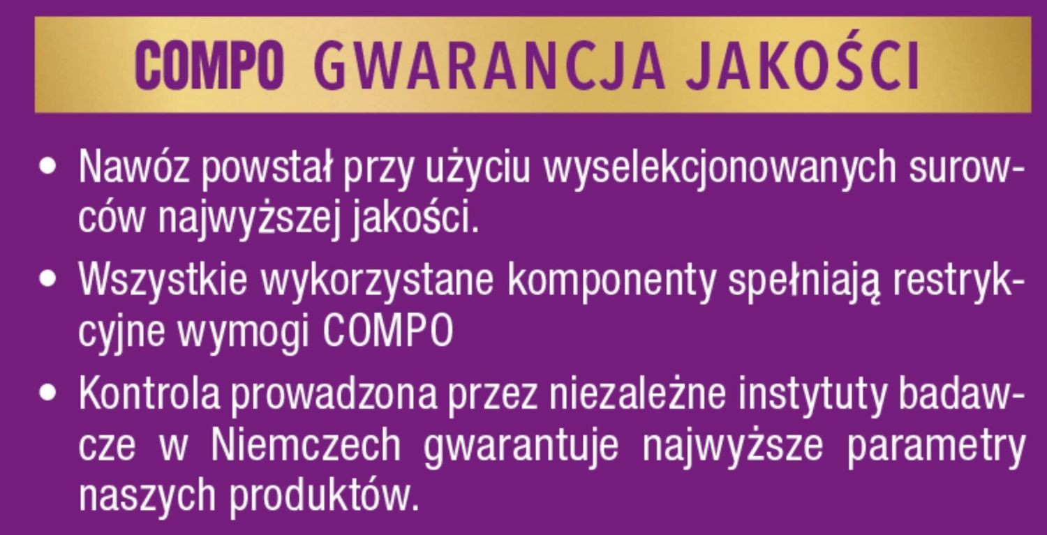 Nawóz długo działający do rododendronów Compo to specjalistyczny preparat przeznaczony do roślin kwaśnolubnych takich jak: hortensje, azalie i rododendrony. Dzięki formule o kontrolowanym uwalnianiu składników odżywczych zapewnia roślinom stałe i zrównoważone odżywianie aż do 6 miesięcy. Odpowiednio dobrany skład wspiera intensywny wzrost, sprzyja obfitemu kwitnieniu oraz pomaga utrzymać odpowiednie pH gleby, co jest kluczowe dla zdrowego rozwoju wymagających roślin. Nawóz wzmacnia system korzeniowy i poprawia odporność na niekorzystne warunki.