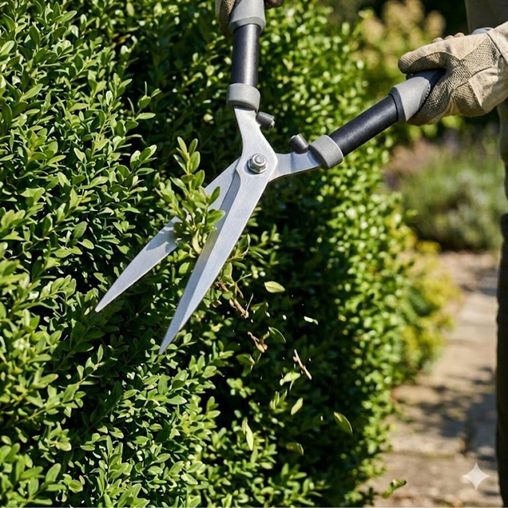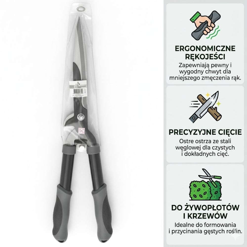 - wysoka precyzja cięcia: Długie, hartowane ostrza pozwalają na uzyskanie idealnie równej płaszczyzny żywopłotu,