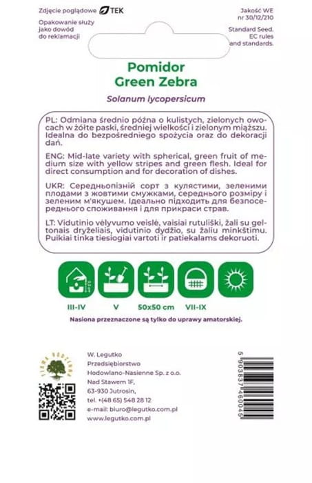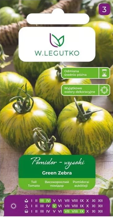 Pomidor 'Green Zebra' to średnio późna odmiana gruntowa i tyczna, o kulistych, zielonych owocach w żółte paski. Owoce są średniej wielkości z zielonym miąższem. Odmiana idealna do bezpośredniego spożycia oraz jako dekoracja dań.