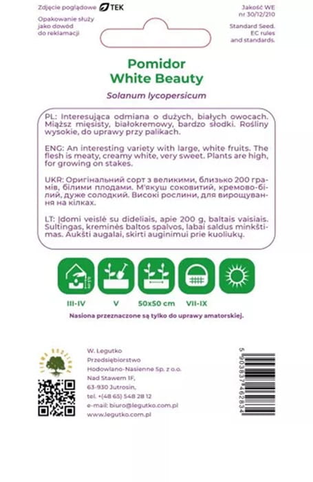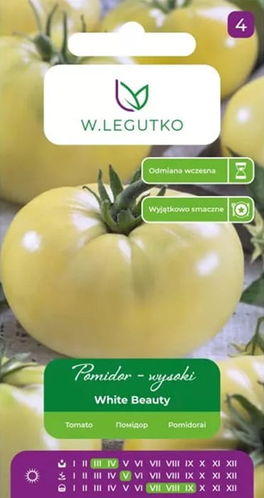 Pomidor 'White Beauty' to odmiana o dużych owocach, a miąższ jest mięsisty, białokremowy, bardzo słodki. Rośliny są wysokie i wymagają palikowania, najlepiej prowadzić je na 1-2 pędy.