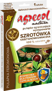 Pułapka feromonowa z serii Agrecol Natura to skuteczne narzędzie w walce ze szkodnikiem kasztanowców – szrotówkiem kasztanowcowiaczkiem (Cameraria ohridella). Selektywnie wabi i łapie jedynie te owady, których chcemy się pozbyć, dlatego jest bezpieczna dla zapylaczy. Pułapka pokryta jest lepkim klejem zawierającym feromony, które przyciągają szkodliwe motyle szrotówka. Zastosowanie pułapki przyczynia się do zmniejszenia uszkodzeń liści spowodowanych przez larwy szkodnika. Specjalna konstrukcja pułapki zapobiega zanieczyszczeniu jej przez opadające liście, co zwiększa jej skuteczność w walce z szkodnikiem. Odławianie szkodników za pomocą pułapki umożliwia monitorowanie ich obecności.