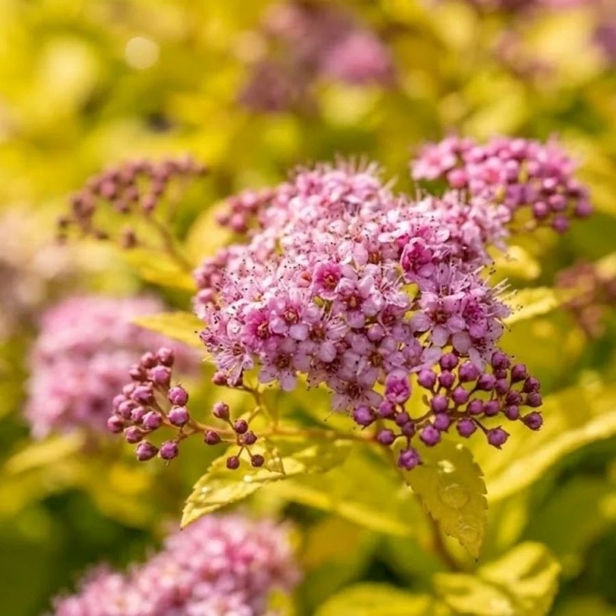 Tawuła japońska Goldmound - Spiraea japonica Goldmound to niski, dekoracyjny krzew liściasty o wyjątkowo efektownym, złocisto-żółtym ulistnieniu. Wiosną młode liście mają intensywnie złoty kolor, który latem nieco się uspokaja, zachowując jednak jasny, atrakcyjny wygląd. W czerwcu i lipcu krzew obsypuje się drobnymi, różowymi kwiatami zebranymi w płaskie kwiatostany, które pięknie kontrastują z liśćmi.