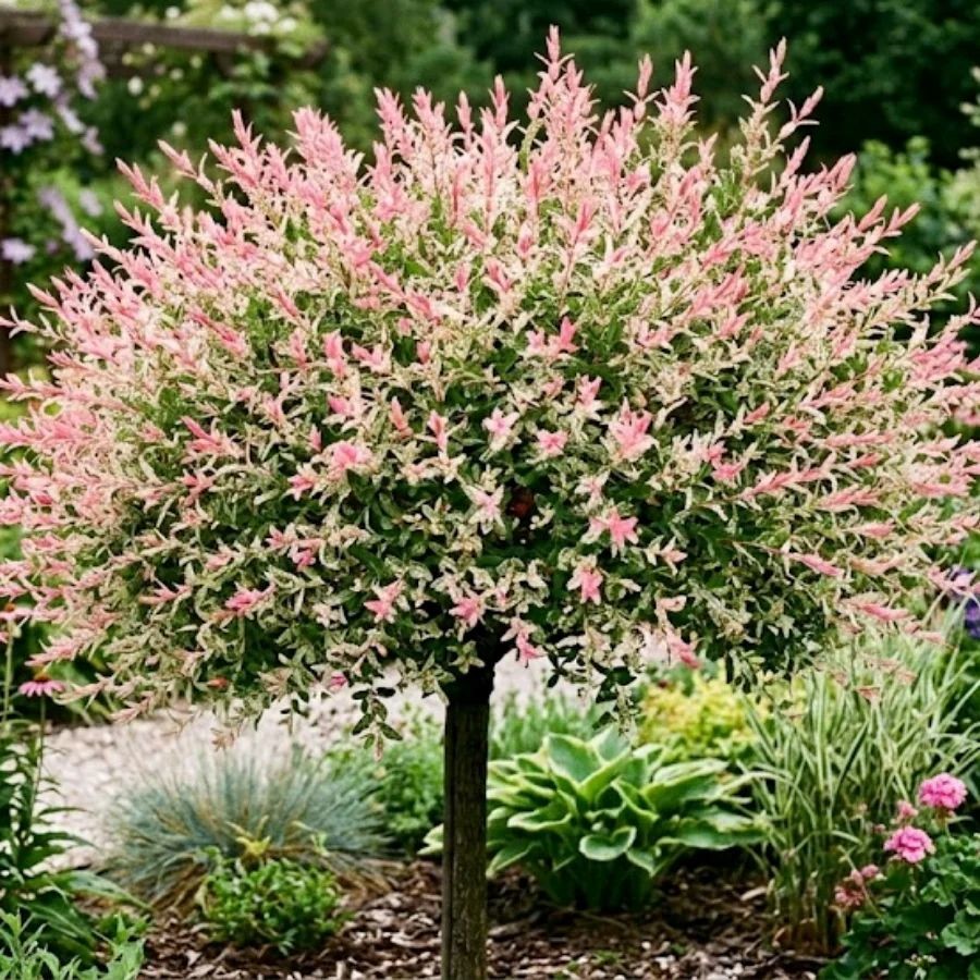 Wierzba całolistna Hakuro-Nishiki - Salix integra Hakuro-Nishiki to niezwykle dekoracyjny krzew lub małe drzewko o efektownym, kolorowym ulistnieniu. Młode przyrosty wiosną są biało-różowo-zielone, co nadaje roślinie wyjątkowo delikatny i elegancki wygląd. Z czasem liście zielenieją, ale krzew nadal pozostaje bardzo atrakcyjny wizualnie przez cały sezon. Roślina często prowadzona jest na pniu, dzięki czemu tworzy formę małego, kulistego drzewka o regularnej, gęstej koronie. Doskonale sprawdza się jako soliter w ogrodzie, przy tarasach, oczkach wodnych oraz w kompozycjach nowoczesnych i naturalistycznych.